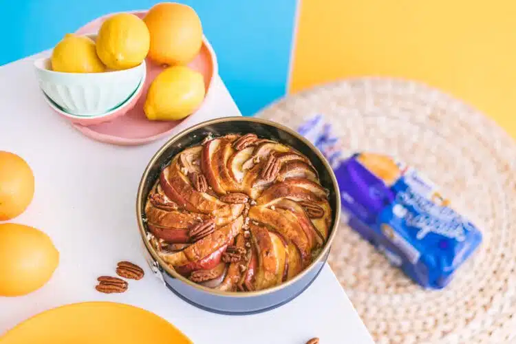 - Kepkite apie 25 minutes, kol paviršius lengvai paruduos. Tuomet ištraukite, pabarstykite riešutais, razinomis, ir dar kepkite apie 20 min. Patiekite su medumi, plakta grietinėle ar karameliniu sirupu.