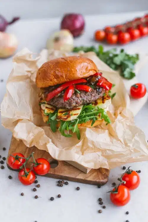 - Mėsainis su harisa padažu ir halloumi sūriu