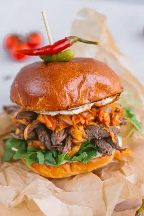 Kiaušinius iškepkite gerai įkaitintoje keptuvėje, pagardinkite juos jūros druska ir čili dribsniais. Mėsainių bandeles apkepkite keptuvėje ar grilyje, kol paruduos. Majonezą sumaišykite su grūdėtomis garstyčiomis ir aptepkite šiuo padažu mėsainių bandeles. Uždėkite rukolos lapų, tada sudėkite dar šiltas apkeptas jautienos juosteles, ant jų uždėkite kimchi kopūstų. Galiausiai uždėkite keptą kiaušinį, o ant jo – bandelę, apteptą padažu. Patiekite mėsainį su marinuotais čili pipirais ir kornišonais.