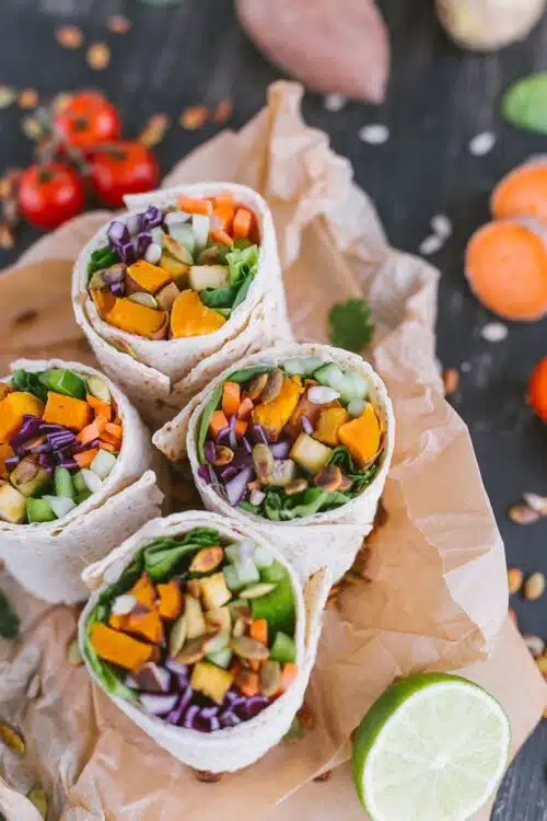 Supjaustykite papriką, morkas, agurkus, špinatus, svogūnų laiškus plonomis juostelėmis. Sutarkuokite mėlynąjį kopūstą. Visas supjaustytas daržoves sudėkite ant daržovinių paplotėlių (vienam suktinukui reikės dviejų). Taip pat sudėkite jau iškeptas ir gerai apskrudusias saldžiųjų bulvių juosteles.