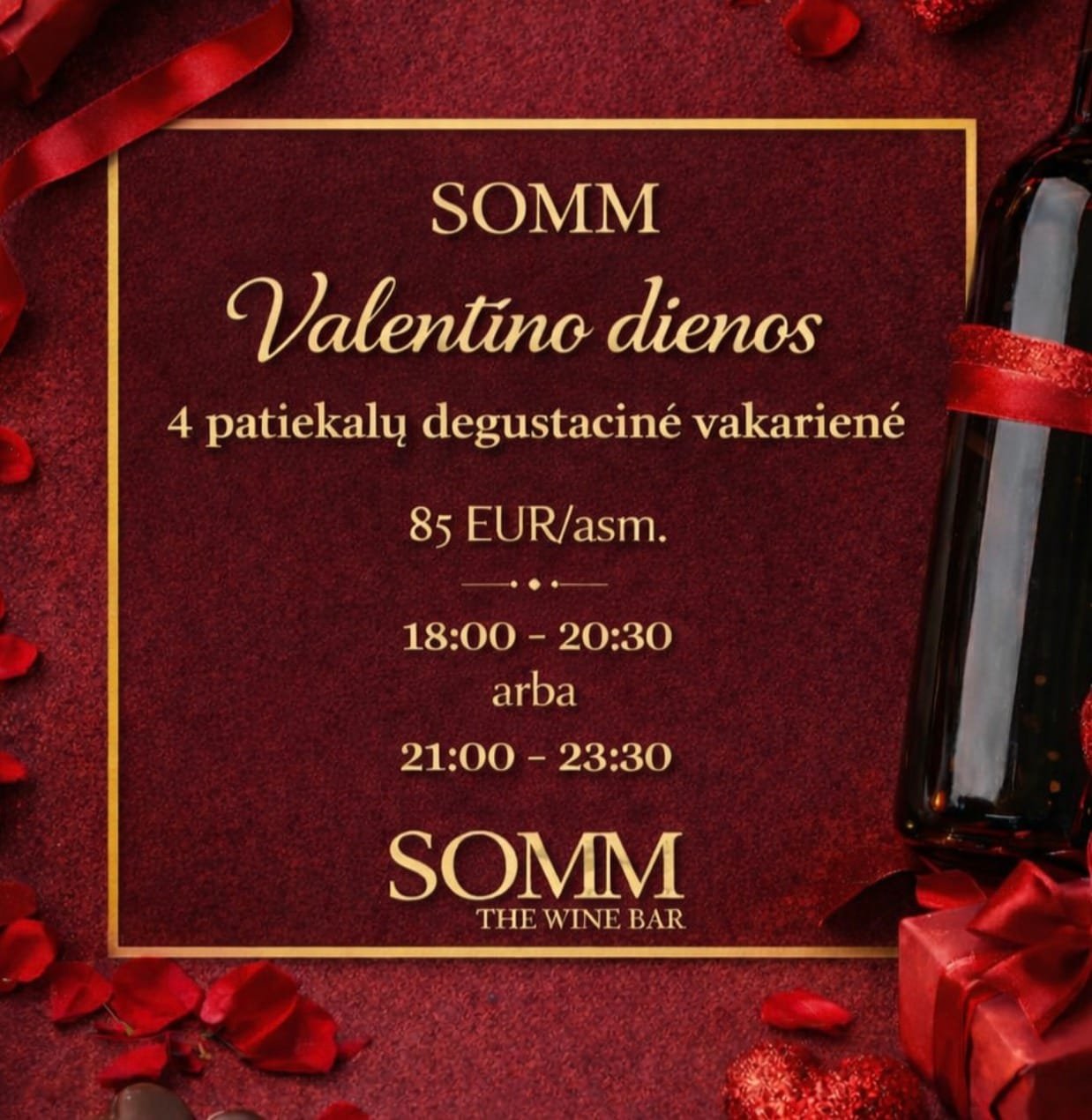 Vienas profesionaliausių vyno barų mieste, kur someljė žinios yra pirmoje vietoje. Tiems, kurie nori „aukštos klasės“ vakaro, somm_lt ruošia 4 patiekalų degustaciją: nuo tuno kapotinio iki jautienos išpjovos. Viskas prasidedės nuo šampano taurės (nes kaipgi kitaip).