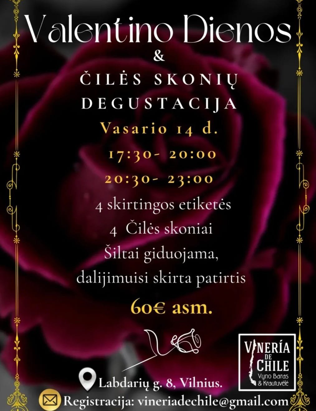 Norite pabėgti nuo lietuviškos žiemos? Vineria de Chile kviečia į Čilės skonių degustaciją. Už 60€ asmeniui gausite 4 skirtingus vynus ir 4 autentiškus Čilės virtuvės užkandžius. Galimi du laikai: 17:30 arba 20:30.