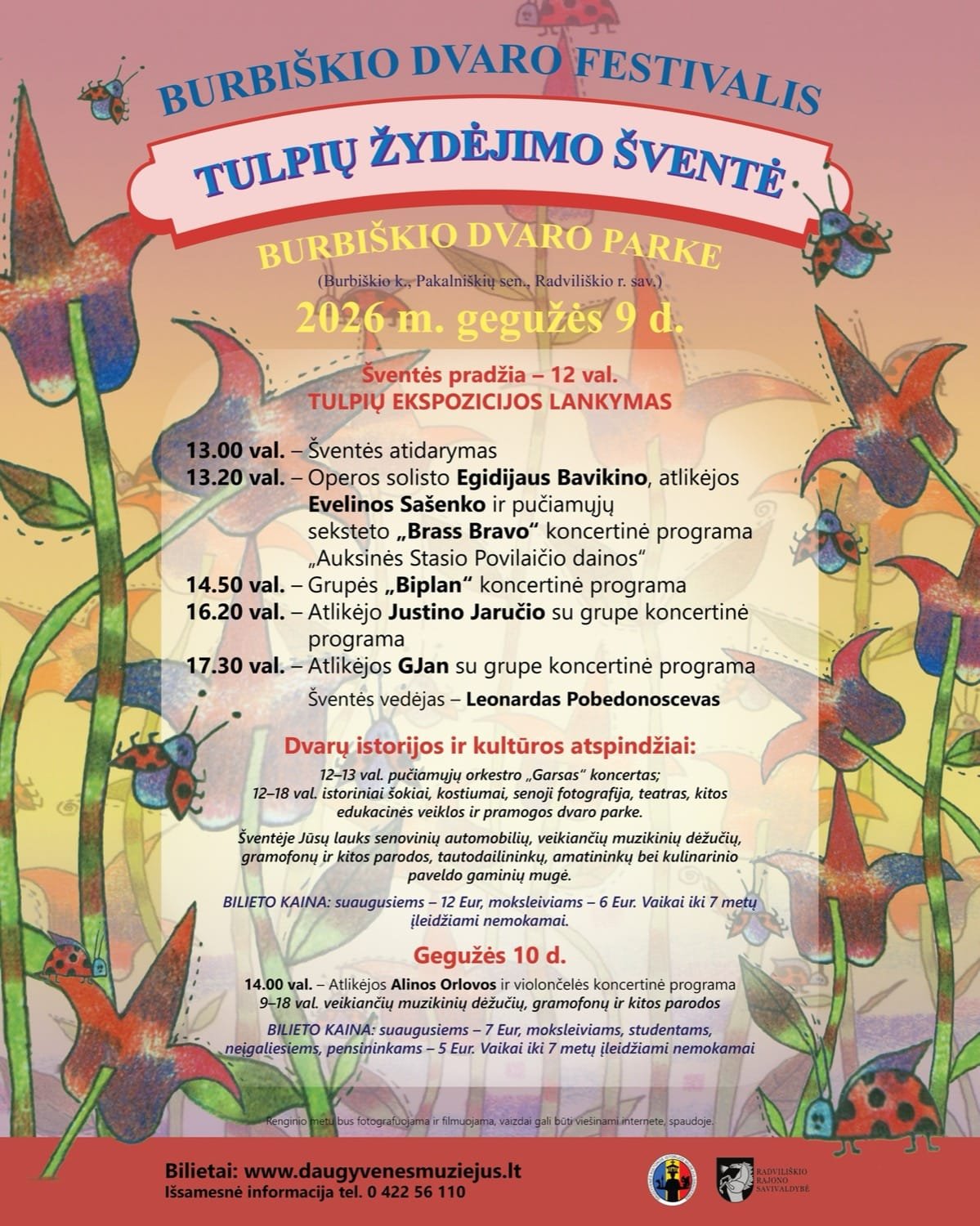 Burbiškio dvaras yra unikalus tuo, kad čia tulpės auginamos ne šiaip sau – tai duoklė dvaro savininko Mykolo Baženskio puoselėtai tradicijai. Ši šventė per 25 metus tapo vieta, kurioje susitinka praeitis ir dabartis, kur menas susilieja su gamta. Tad kraukitės kameras, gražiausią pavasarinę aprangą ir susitinkame ten, kur žydi tulpės. Tulpių žydėjimo šventė 2026 laukia jūsų!